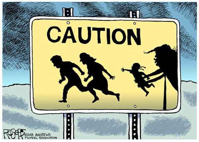One of Rob Rogers’ recent illustrations that did not make print was this one depicting presumably illegal immigrants with their child being snatched away by Trump. He was fired by the Pittsburg Post-Gazette because of it and other cartoons about Trump being “angry and mean instead of funny and clever”. “Outraged and unsparing” is what every decent American should feel, besides feeling shame and repentance for the monster who sits in the Oval Office.
