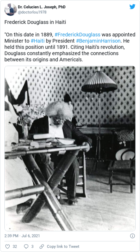 In the years just before his death, Frederick Douglass, the great Black orator and abolitionist, spent a two-year stint as the American consul to Haiti. In 1893, he delivered a speech at the World’s Fair in Chicago, where he championed the power of Haiti’s story. “We should not forget that the freedom you and I enjoy today,” he said, “is largely due to the brave stand taken by the black sons of Haiti ninety years ago. … Striking for their freedom, they struck for the freedom of every black man in the world.”